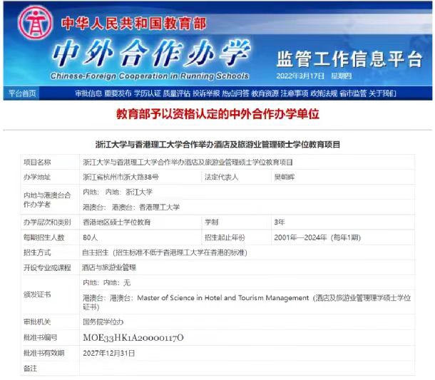 ¾Æµê¼°ÂÃÓÎÒµ¹ÜÀí˶ʿѧλÏîÄ¿ÒÀÍÐÏã¸ÛÀí¹¤´óѧ¼°Õã½´óѧ£¬ÊǹúÄÚÕýʽͨ¹ý¹ú¼Ò½ÌÓý²¿¸´ºËµÄÖÐÍâºÏ×÷°ìѧÏîÄ¿£¬2000Äê»ñ¹ú¼Ò½ÌÓý²¿Åú×¼£¨Åú×¼±àºÅMOE33HK1A20000117O£©£¬ÓÉÏã¸ÛÀí¹¤´óѧ°ä·¢Ë¶Ê¿Ñ§Î»£¬»ñ¹ú¼Ê¼°¹úÄÚ³ÐÈÏ¡£Ä¿Ç°£¬¾Æµê¼°ÂÃÓÎÒµ¹ÜÀí˶ʿѧ루HTM£©ÏîÄ¿ÒѳÉΪ¹ú¼Ê¹úÄÚ¼«¾ßÆ·ÅÆÓ°ÏìÁ¦µÄ¾Æµê¼°ÂÃÓÎҵѧλÏîÄ¿¡£