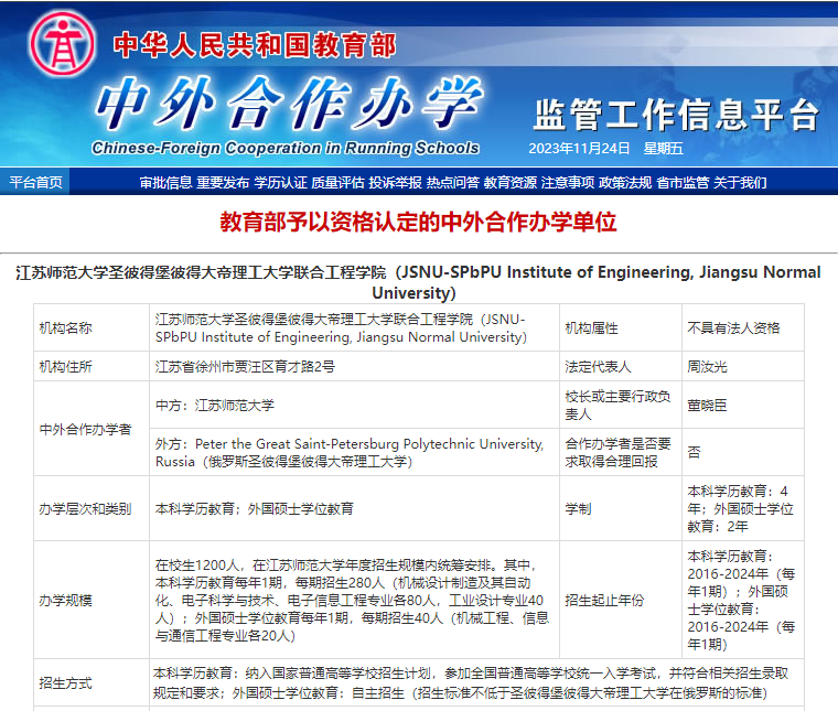 2016Äê4ÔÂ18ÈÕ£¬ÖлªÈËÃñ¹²ºÍ¹ú½ÌÓý²¿Í¬Òâ½ËÕʦ·¶´óѧÓë¶íÂÞ˹ʥ±ËµÃ±¤±ËµÃ´óµÛÀí¹¤´óѧºÏ×÷ÉèÁ¢”½ËÕʦ·¶´óѧ-Ê¥±ËµÃ±¤±ËµÃ´óµÛÀí¹¤´óѧÁªºÏ¹¤³ÌѧԺ”£¬¸Ã»ú¹¹ÎªÎÒ¹úµÚÒ»¸öÖжíºÏ×÷°ìѧµÄ·Ç¶ÀÁ¢·¨È˰ìѧ»ú¹¹¡£